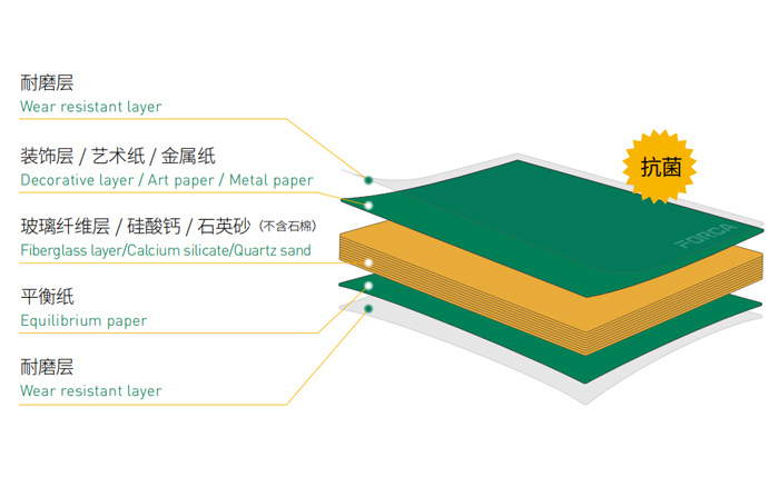 • 福爾卡?醫(yī)耐板?(玻纖復合不燃板)是由耐磨層、裝飾層、玻璃纖維層、硅酸鈣、石英砂(不含石棉)和平衡紙,表面經過三聚氰胺樹脂與特種改性樹脂浸漬層疊后高溫高壓而成,產品的密度不低于1650KG/m3,厚度從4mm 到12mm,形成了整體A級防火、密度高、硬度高、表面毛孔很小的纖維板。